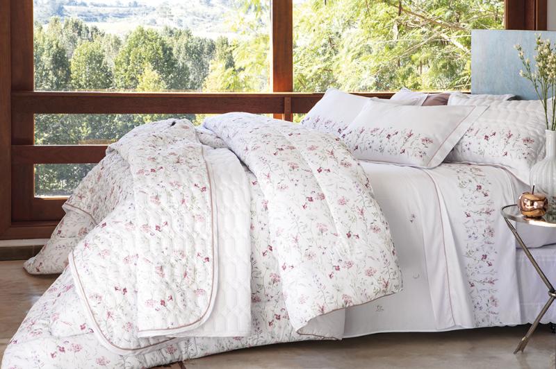 Produzido em tecido matelassê 100% algodão, percal acetinado 300 fios e enchimento 100% poliéster.